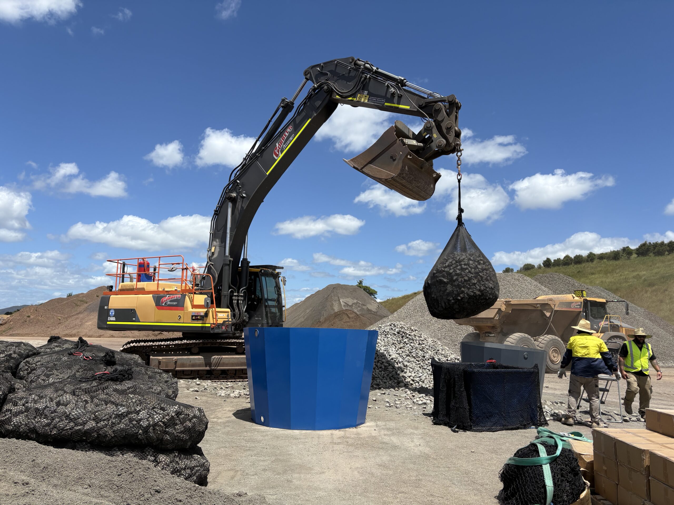 Regular flooding in the central west areas of New South Wales saw local rivers scouring away embankments impacting local land whilst increased sediment flowed down stream. A number of sites required immediate remediation and Rock Bag Filter Units were the chosen armouring system for efficiency and safety. Our autonomous self release hook was utilsed on almost vertical embankments allowing the crane operator to place and release the rock bags with-out human intervention.